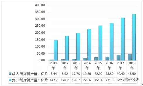 2018年我國成人紙尿褲產(chǎn)量為45.50億片,產(chǎn)量較上年同期增長(cháng)12.62%;2018年我國嬰兒紙尿褲產(chǎn)量為335.9億片,產(chǎn)量同比增長(cháng)8.28%。