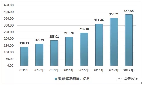 2017年我國紙尿褲產(chǎn)品消費量為355.21億片,2018年我國紙尿褲產(chǎn)品消費量約為382.36億片。