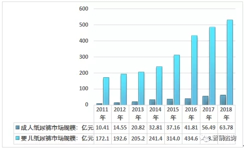 2011-2018年我國紙尿褲市場(chǎng)規模走勢圖