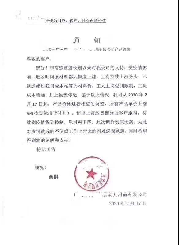 “3月1日起,旗下所有產(chǎn)品上調5%”,“產(chǎn)品價(jià)格進(jìn)行相應調整,原有的價(jià)格體系取消”。所有產(chǎn)品單價(jià)上漲5%,超出正常運費部分由客戶(hù)承擔,持續到疫情得到控制,原材料下降”