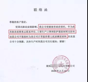 “受政委委托,作為此次疫情重點(diǎn)聯(lián)系單位,主要生產(chǎn)口罩和防護服原材料無(wú)紡布,不能按時(shí)正常提供嬰兒紙尿褲原材料”
