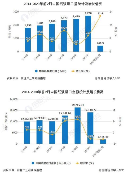 據中國海關(guān)總署統計數據顯示,2019年去年中國紙漿進(jìn)口量達到了2720萬(wàn)噸,累計增長(cháng)9.7%。截止至2020年1-2月中國紙漿進(jìn)口量達到468.9萬(wàn)噸,相比上年同期增長(cháng)了83萬(wàn)噸,累計增長(cháng)21.4%。