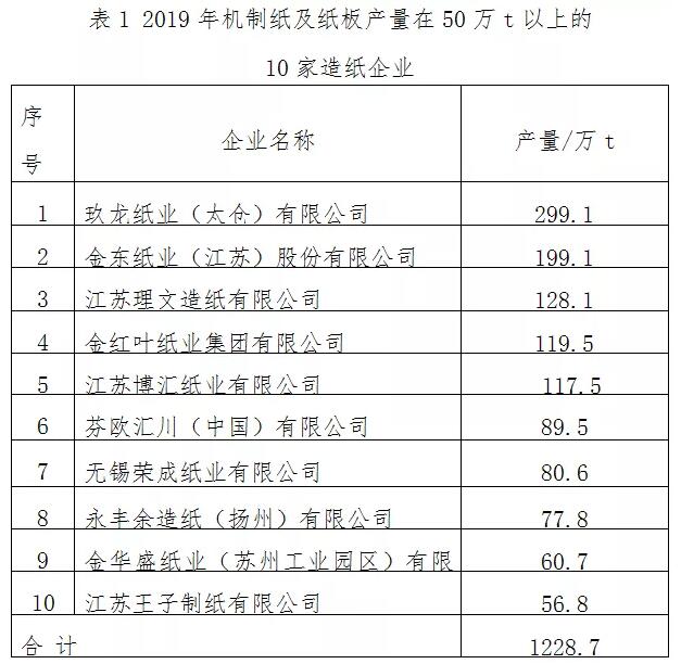 2019年機制紙及紙板產(chǎn)量達到10萬(wàn)t的造紙企業(yè)共20家,產(chǎn)量在50萬(wàn)t以上的企業(yè)有10家(見(jiàn)表1)。