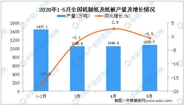 根據中國輕工業(yè)信息中心數據顯示,2020年1-5月,全國機制紙及紙板產(chǎn)量4636.2萬(wàn)噸,同比下降6.8%。5月當月,全國機制紙及紙板產(chǎn)量1076.7萬(wàn)噸,同比下降0.5%。