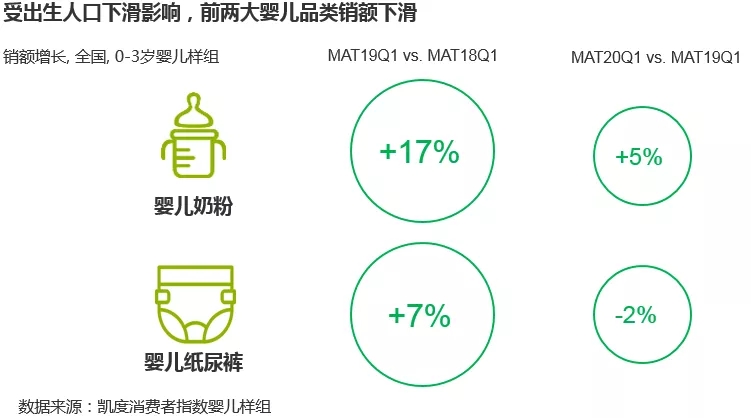 受到新生人口減少的影響,母嬰市場(chǎng)兩大頭部品類(lèi)——奶粉和紙尿褲增長(cháng)開(kāi)始放緩。凱度消費者指數顯示,2019年一季度嬰兒紙尿褲銷(xiāo)售額同比增長(cháng)7%,但2020年一季度同比下滑了2%,這一部分下跌與年初的疫情事實(shí)上關(guān)系不大。多位資深從業(yè)者表示,即便身處動(dòng)蕩的疫情環(huán)境下,消費者對于奶粉、紙尿褲這樣的剛需產(chǎn)品的投入絲毫不會(huì )吝嗇。