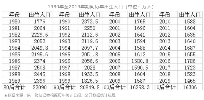 新生人口是母嬰行業(yè)基本盤(pán)中的基本盤(pán)。進(jìn)入21世紀以來(lái),這二十年間總共有多少人出生?隨著(zhù)出生率逐年下降,00后和10后,相比80后和90后,究竟少了多少人?近日,第一財經(jīng)根據歷年統計公報、公開(kāi)數據統計梳理發(fā)現,我國80后、90后、00后、10后人數分別為2.21億、2.08億、1.63億(16258萬(wàn))、1.63億(16306萬(wàn))。