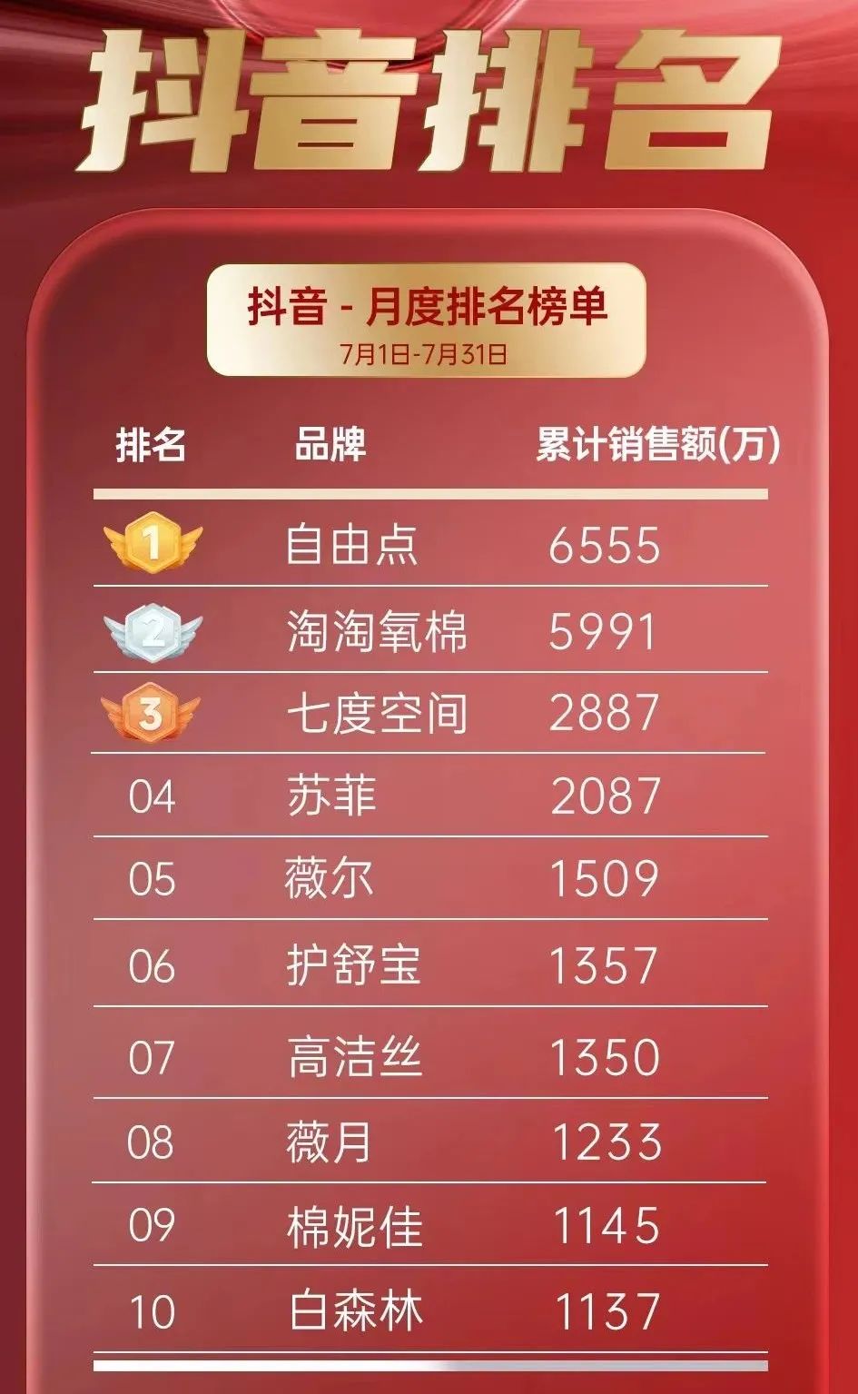 根據第三方數據平臺顯示,抖音平臺2024年7月份衛生巾前十銷(xiāo)售榜單,其中,“自由點(diǎn)”品牌以6555萬(wàn)元的銷(xiāo)售額高居榜首,展現出了強大的市場(chǎng)號召力和消費者認可度。