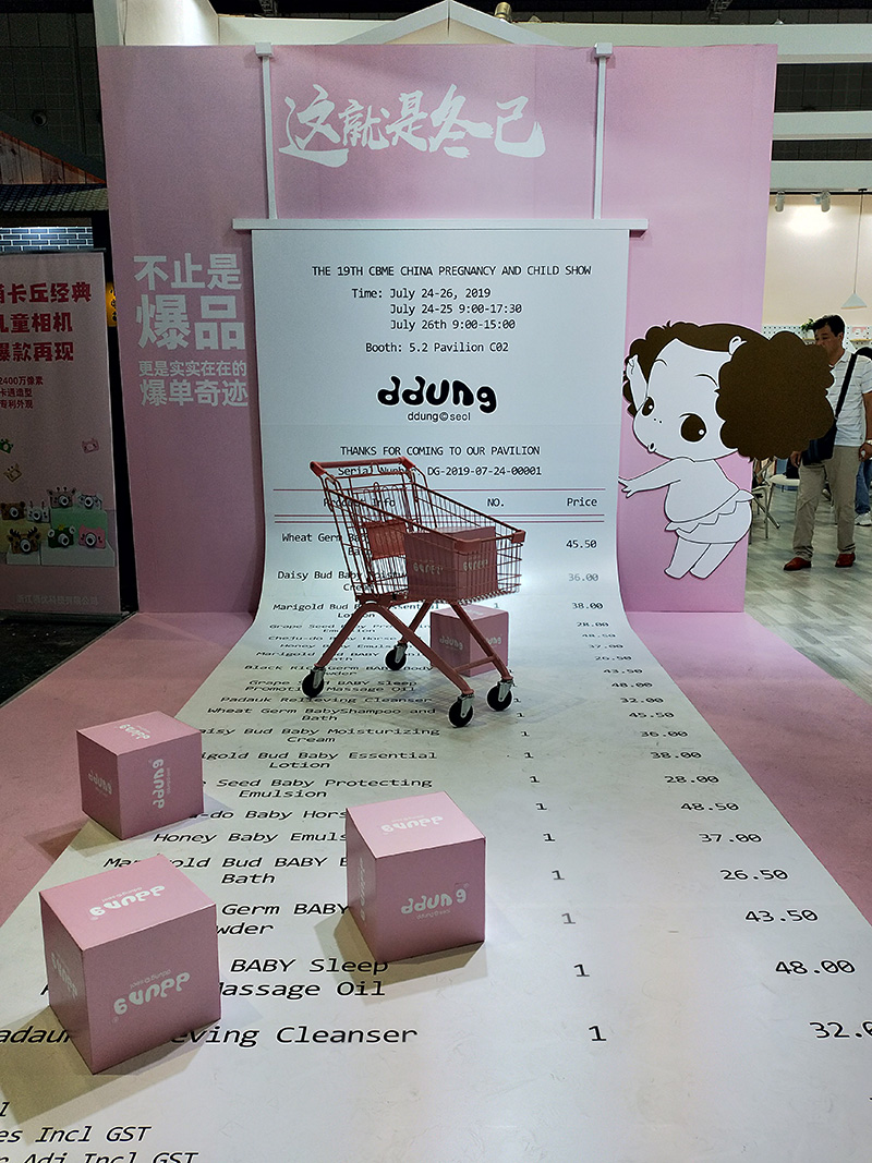 冬己展位結合卡通IP做出購物車(chē)和賬單的場(chǎng)景,巧妙地利用場(chǎng)地空間制造立體視覺(jué),頗具想象力的設計實(shí)現有效地引流。